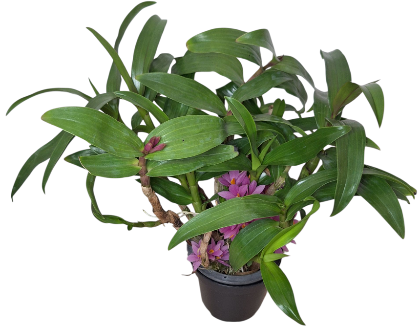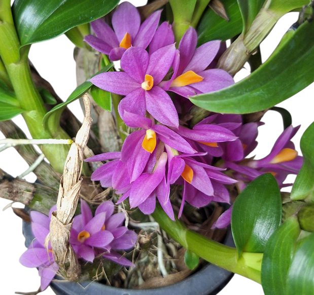 Dendrobium Hibiki je mimořádně oblíbený moderní hybrid, známý pro své zářivě růžovofialové květy s oranžovým pyskem a kompaktní růst. Tento kříženec vyniká dlouhou dobou kvetení, odolností a schopností kvést několikrát do roka. Patří mezi nejatraktivnější Dendrobia vhodná i pro pěstování v bytových podmínkách.