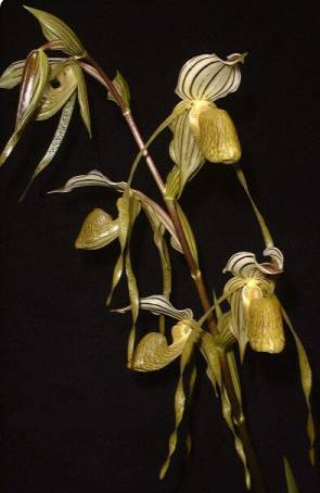 Barva květů je zelenavě žlutá až olivová, s vínovými skvrnami a pruhy.